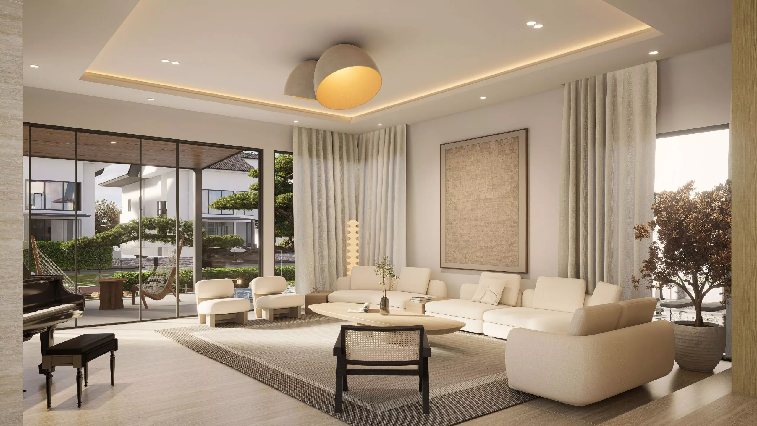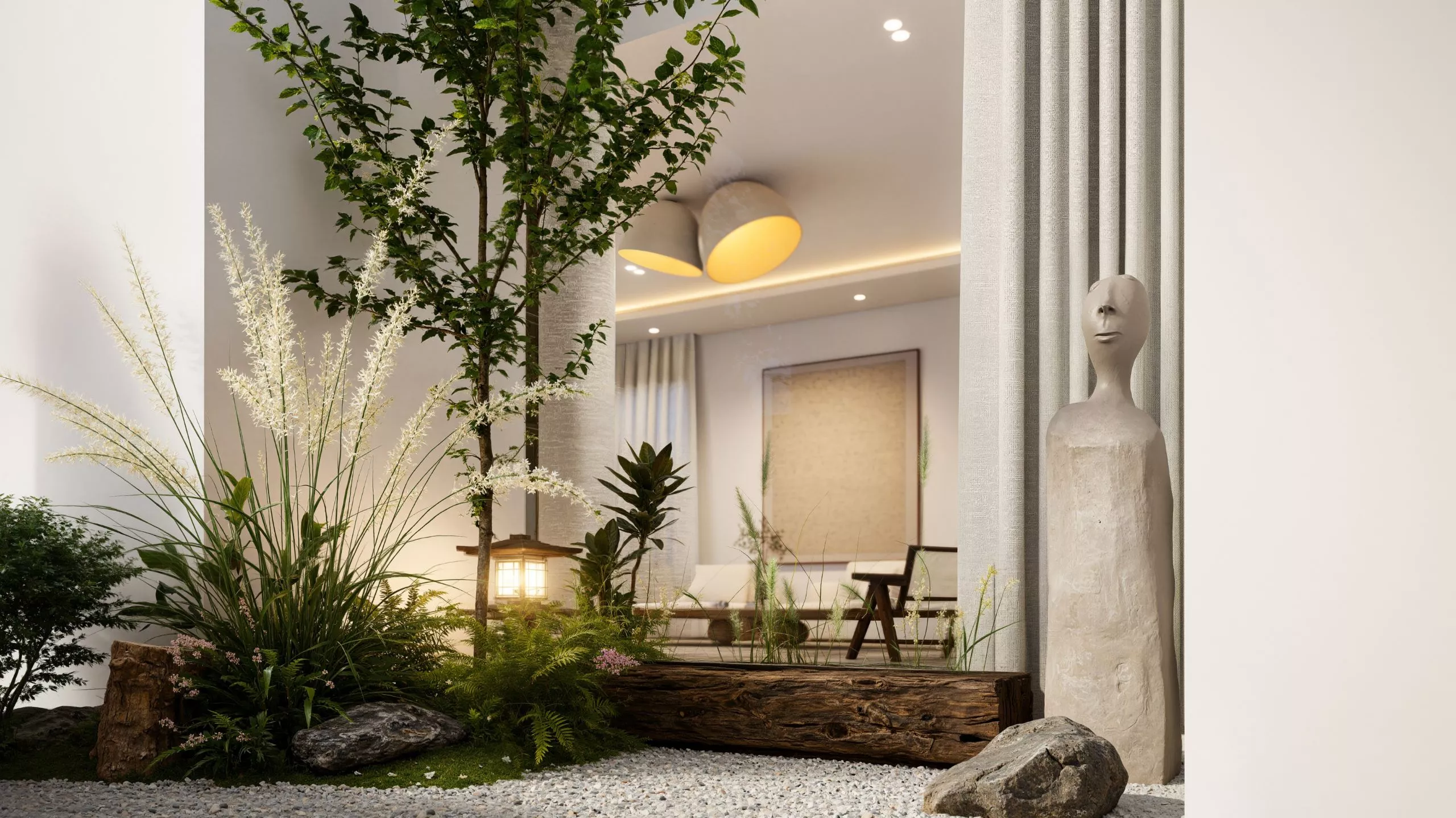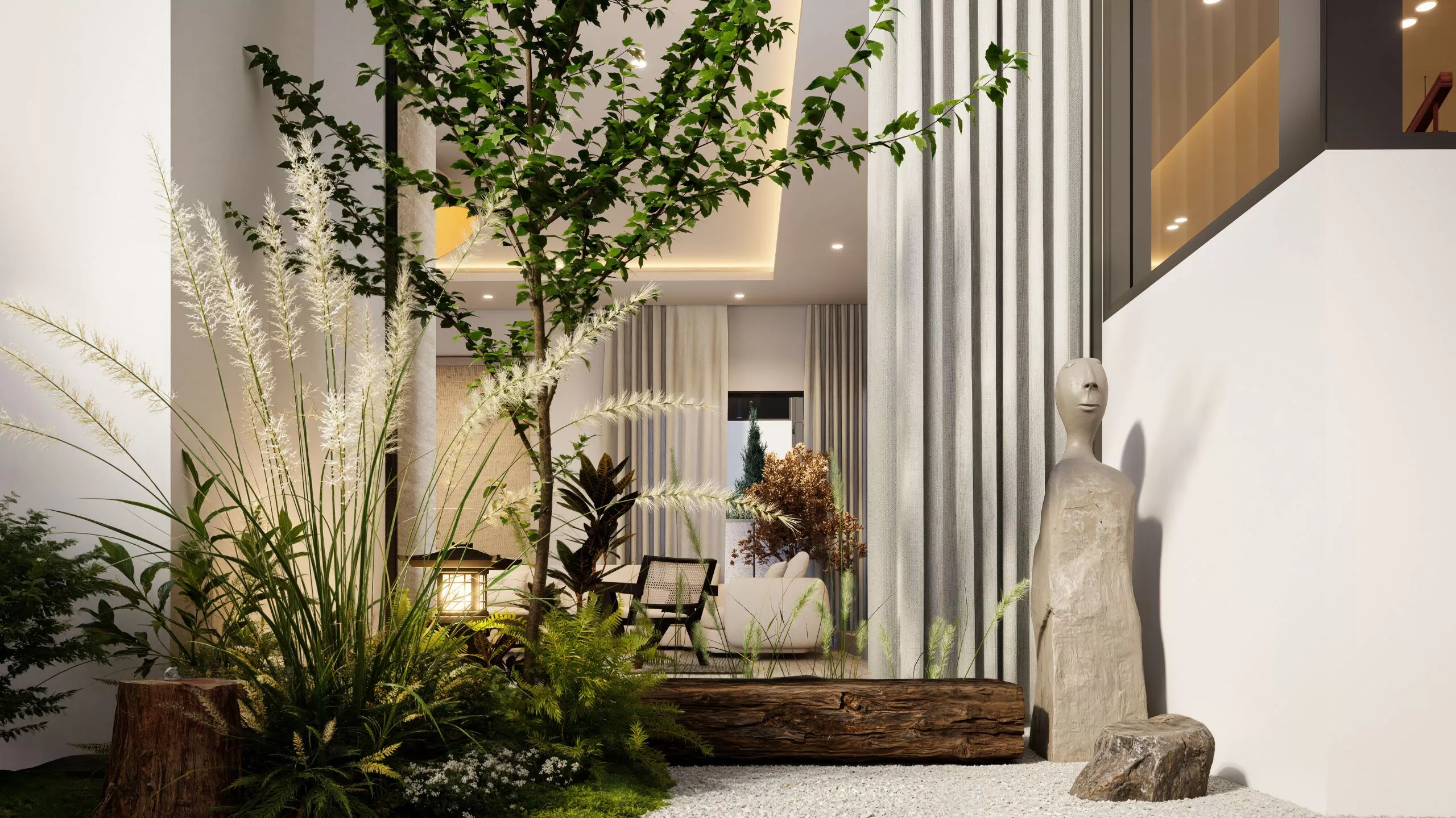 A retreat that breathes serenity at every turn. The outdoor design embraces ease, with simple, refined layouts, natural textures, and lush greenery. It flows with the interior ethos – peaceful, tactile, and effortlessly elegant.