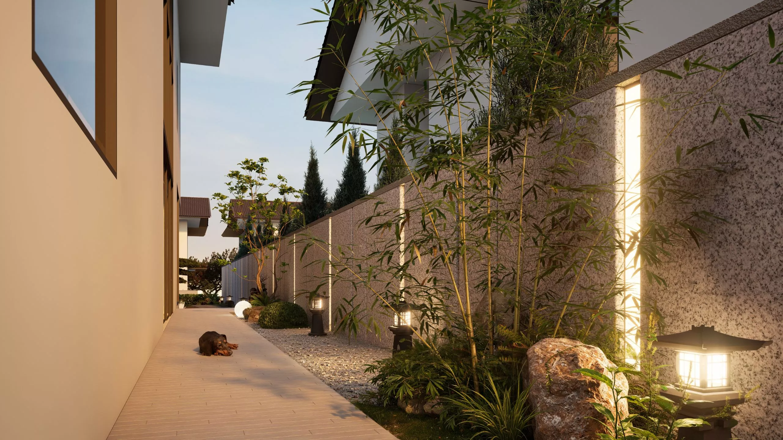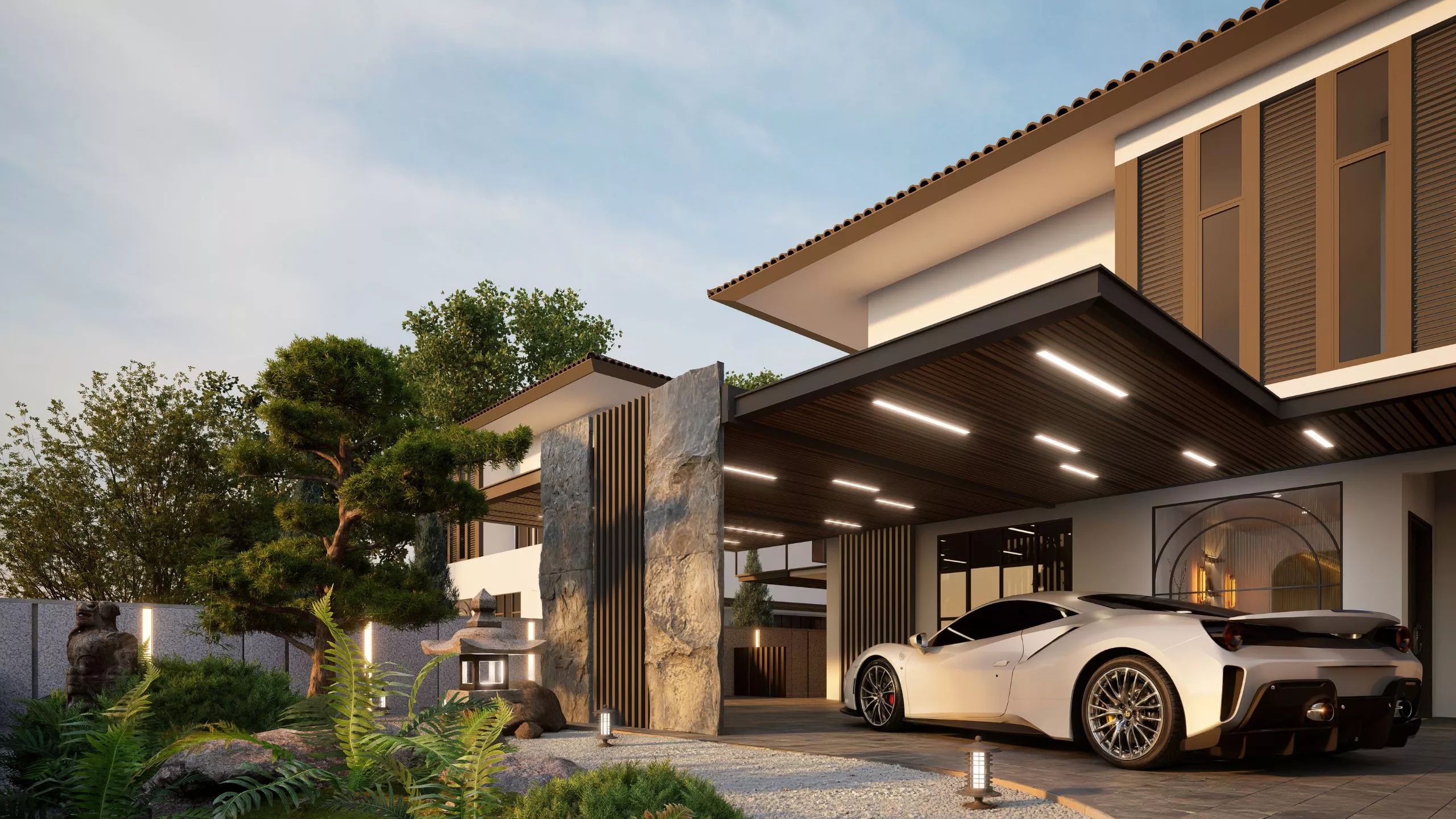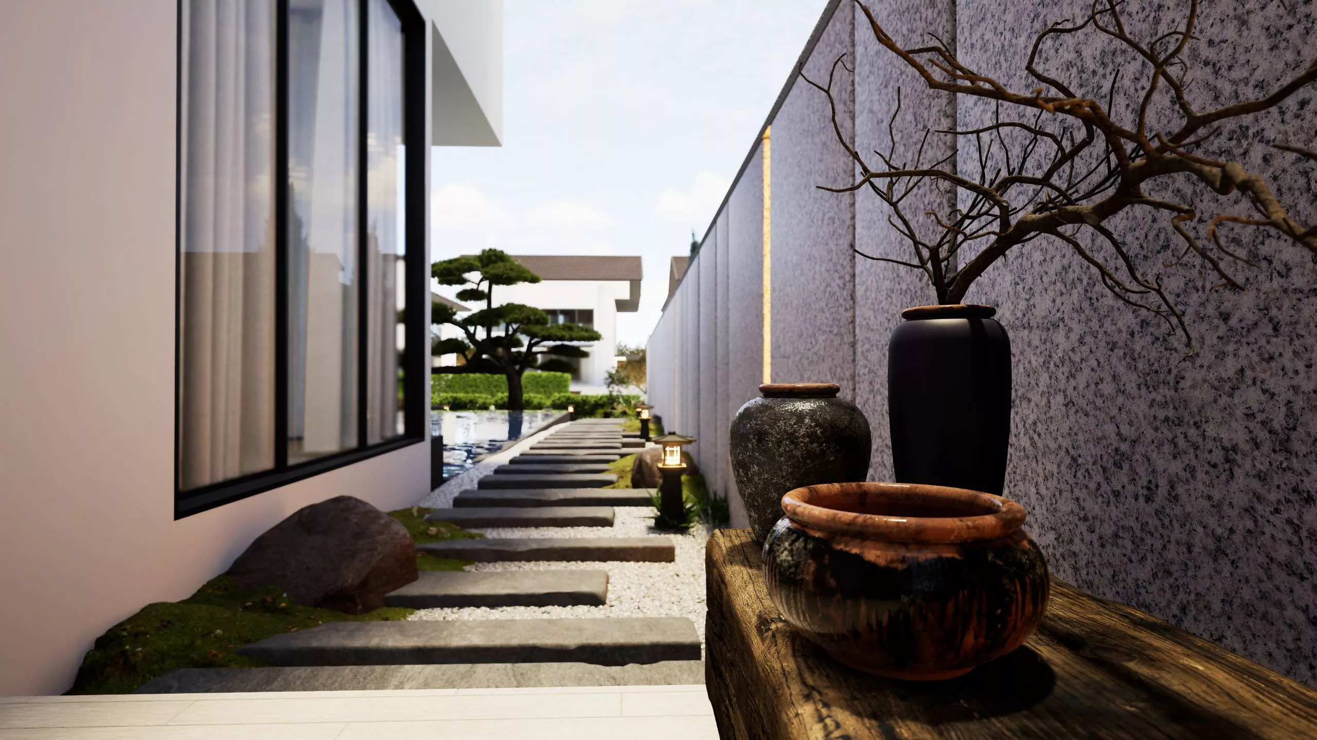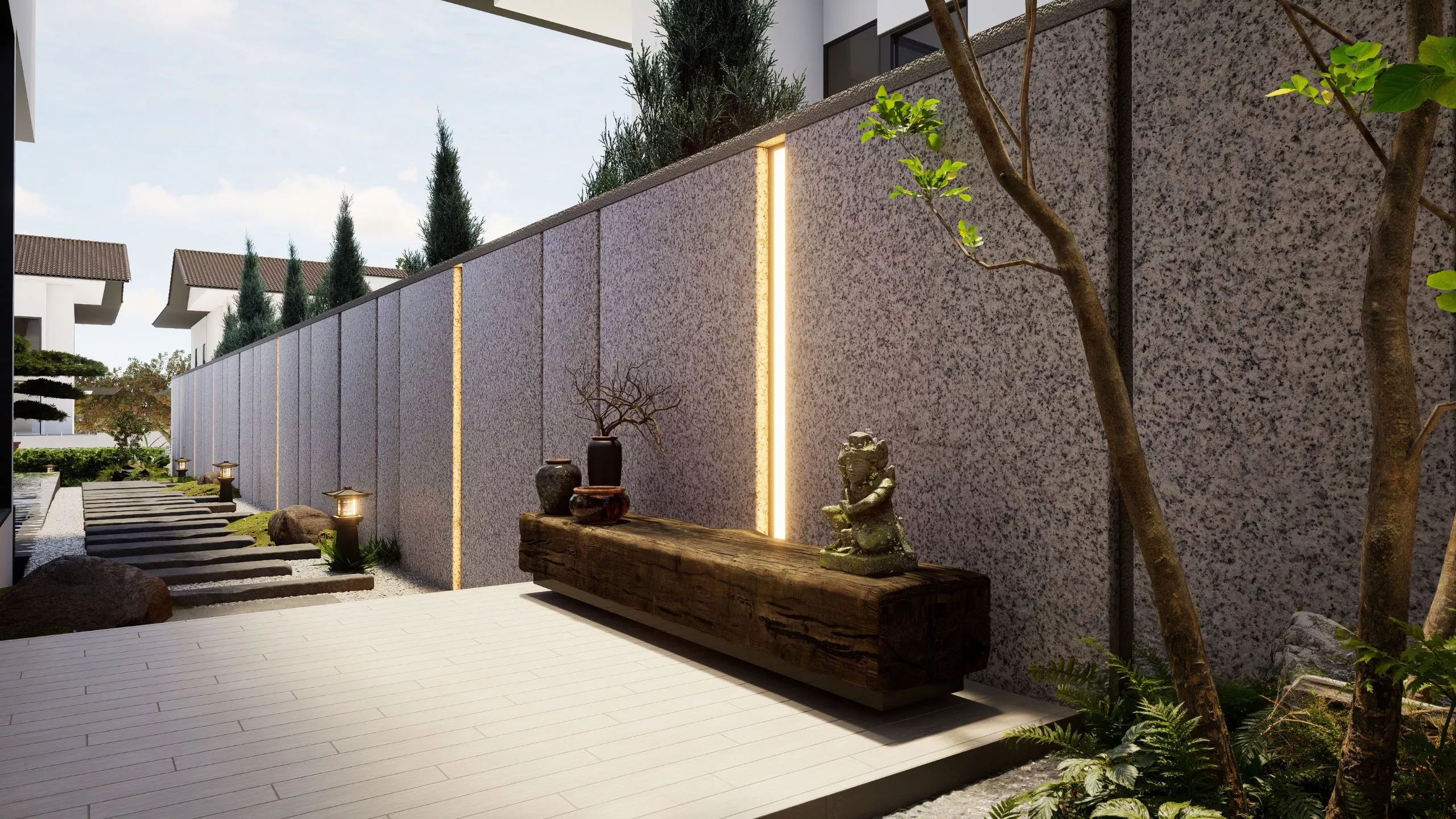 A retreat that breathes serenity at every turn. The outdoor design embraces ease, with simple, refined layouts, natural textures, and lush greenery. It flows with the interior ethos – peaceful, tactile, and effortlessly elegant.