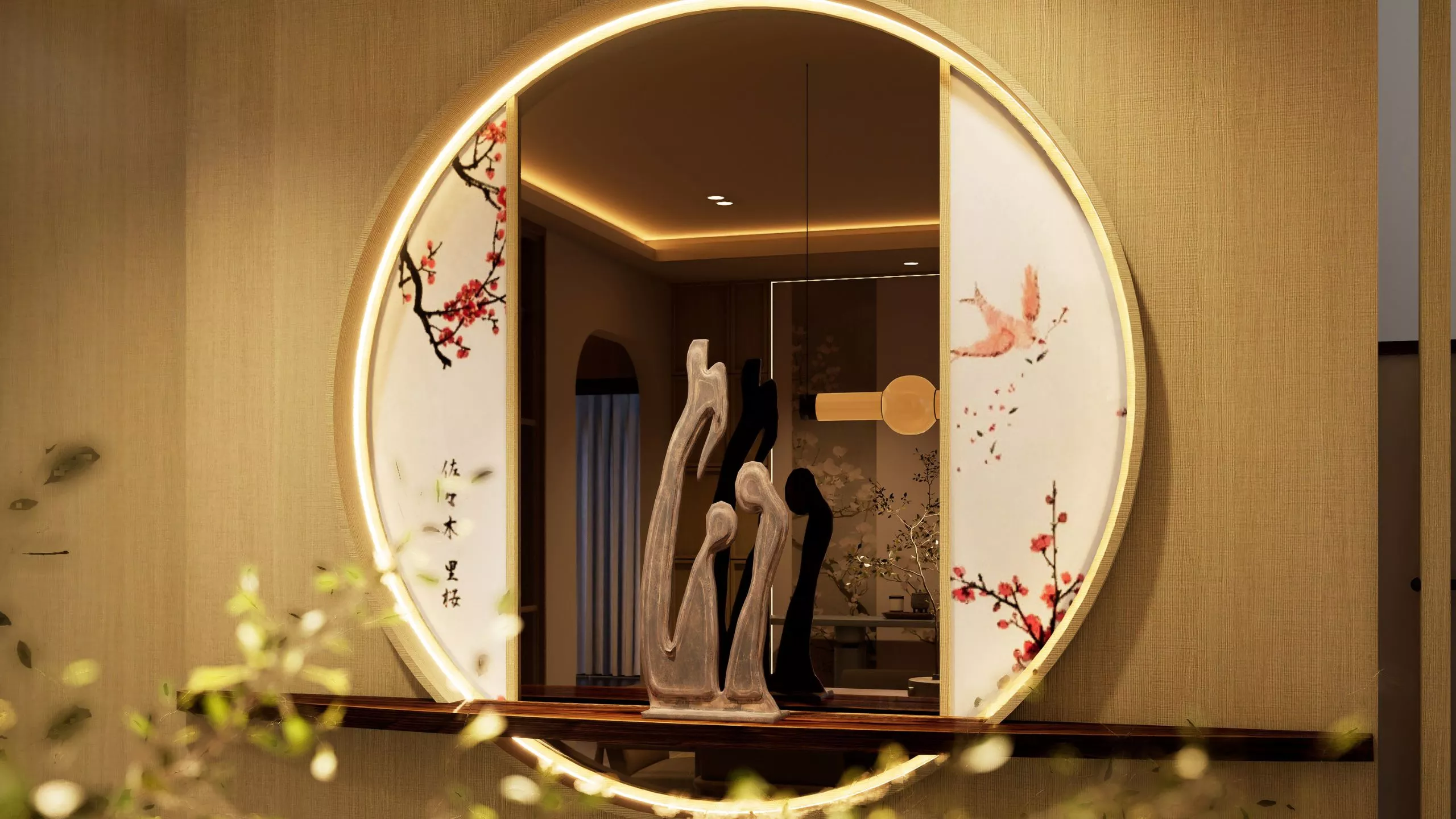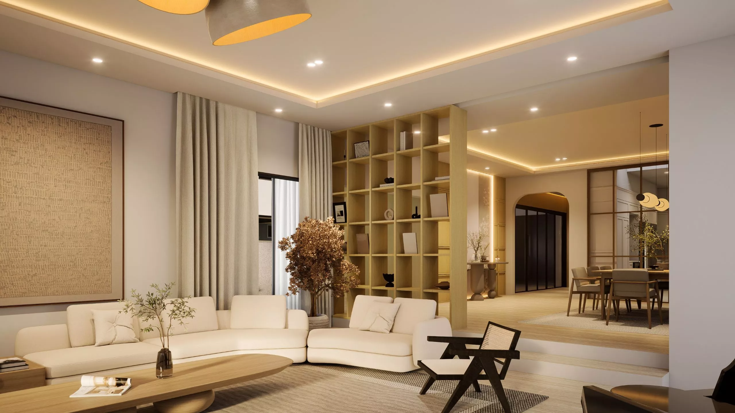 A gracious welcome that feels effortlessly refined. The entrance welcomes you with a palette of warm tones and tactile layers – soft linens, polished stone, and ambient lighting that drapes the foyer in a gentle glow. Subtle storage and seating elements feel natural and intuitive, ensuring the foyer is both functional and beautifully poised.