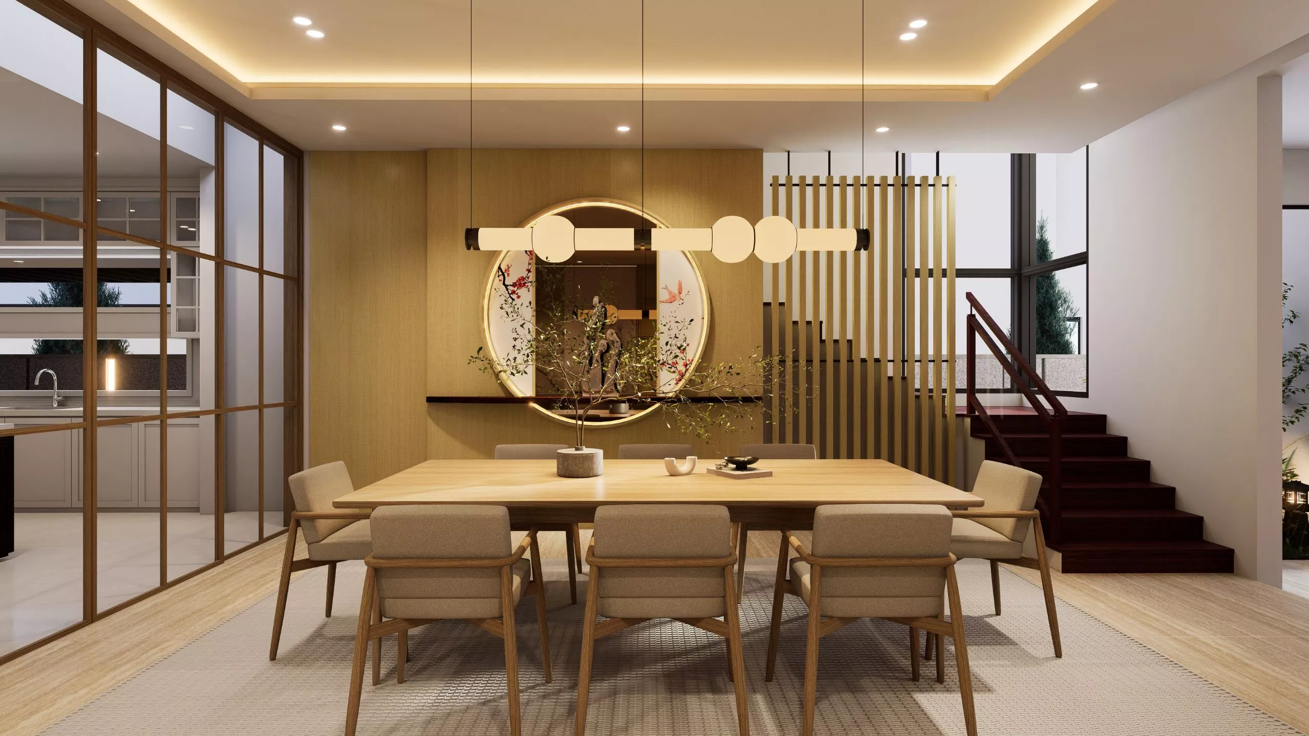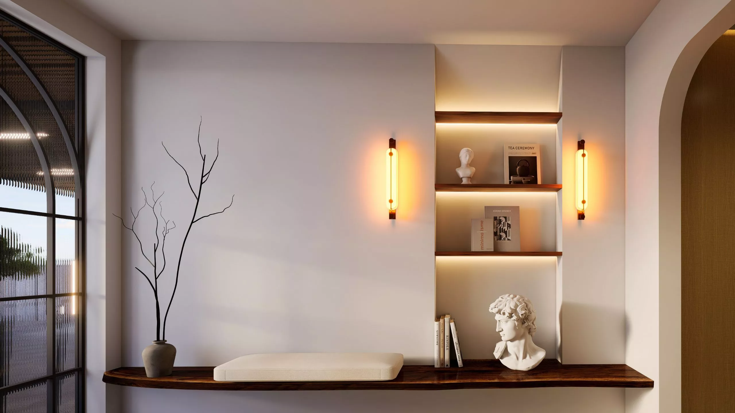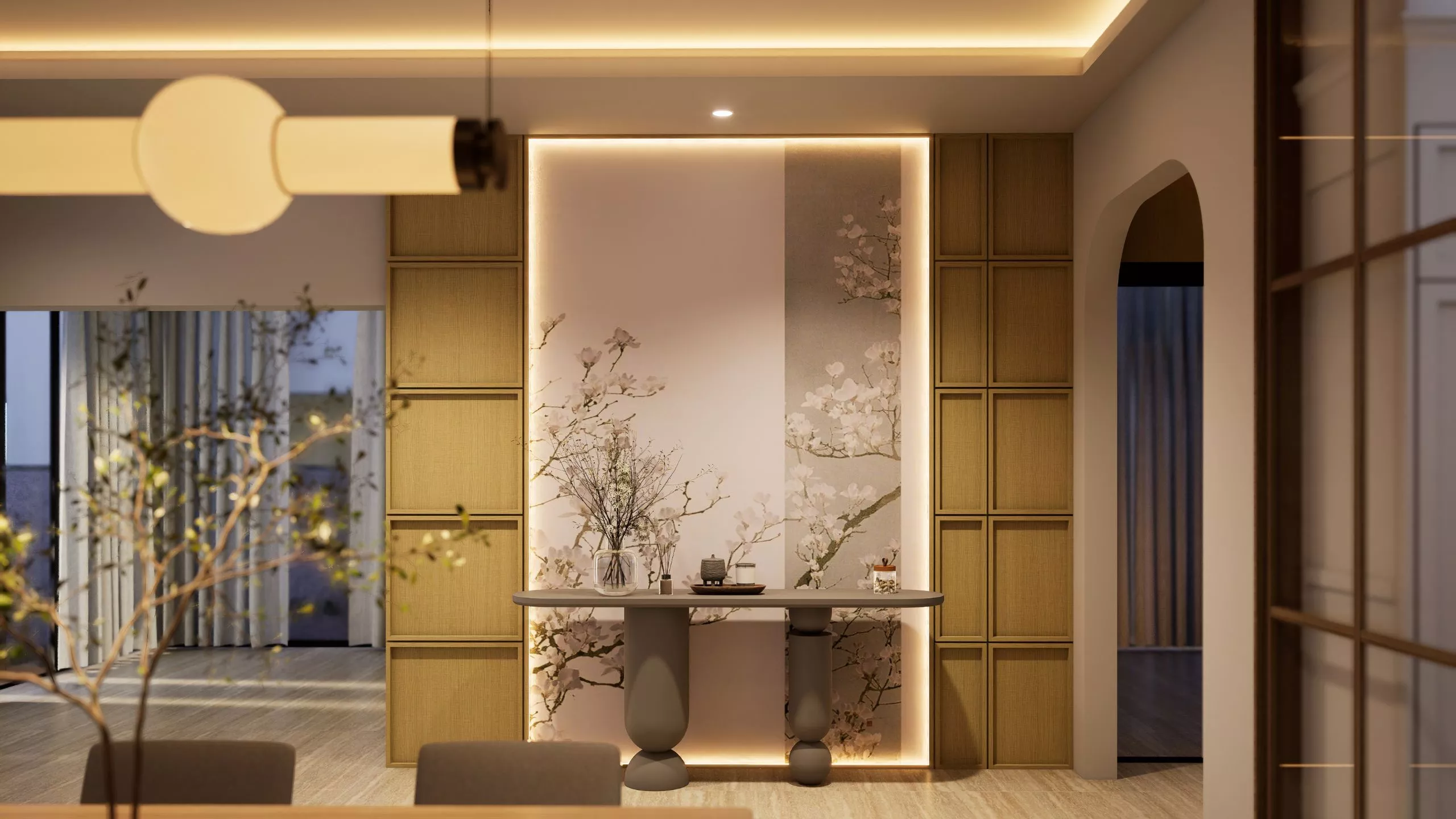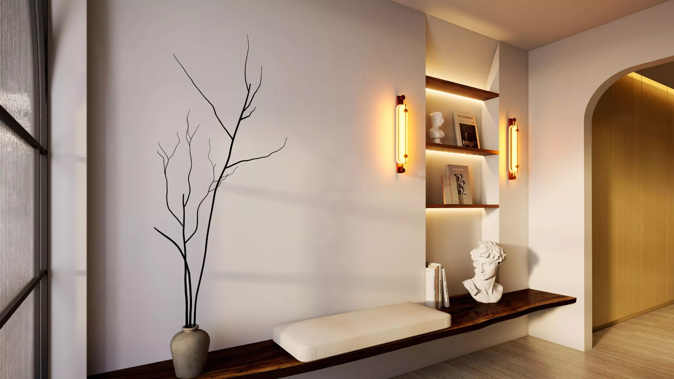 A seamless passage that delights in its simplicity. The hallway flows from room to room with understated elegance: minimalist decor, textural layering, and softly diffused illumination. It offers a quiet sophistication, guiding movement with ease while maintaining an intimate, approachable atmosphere.