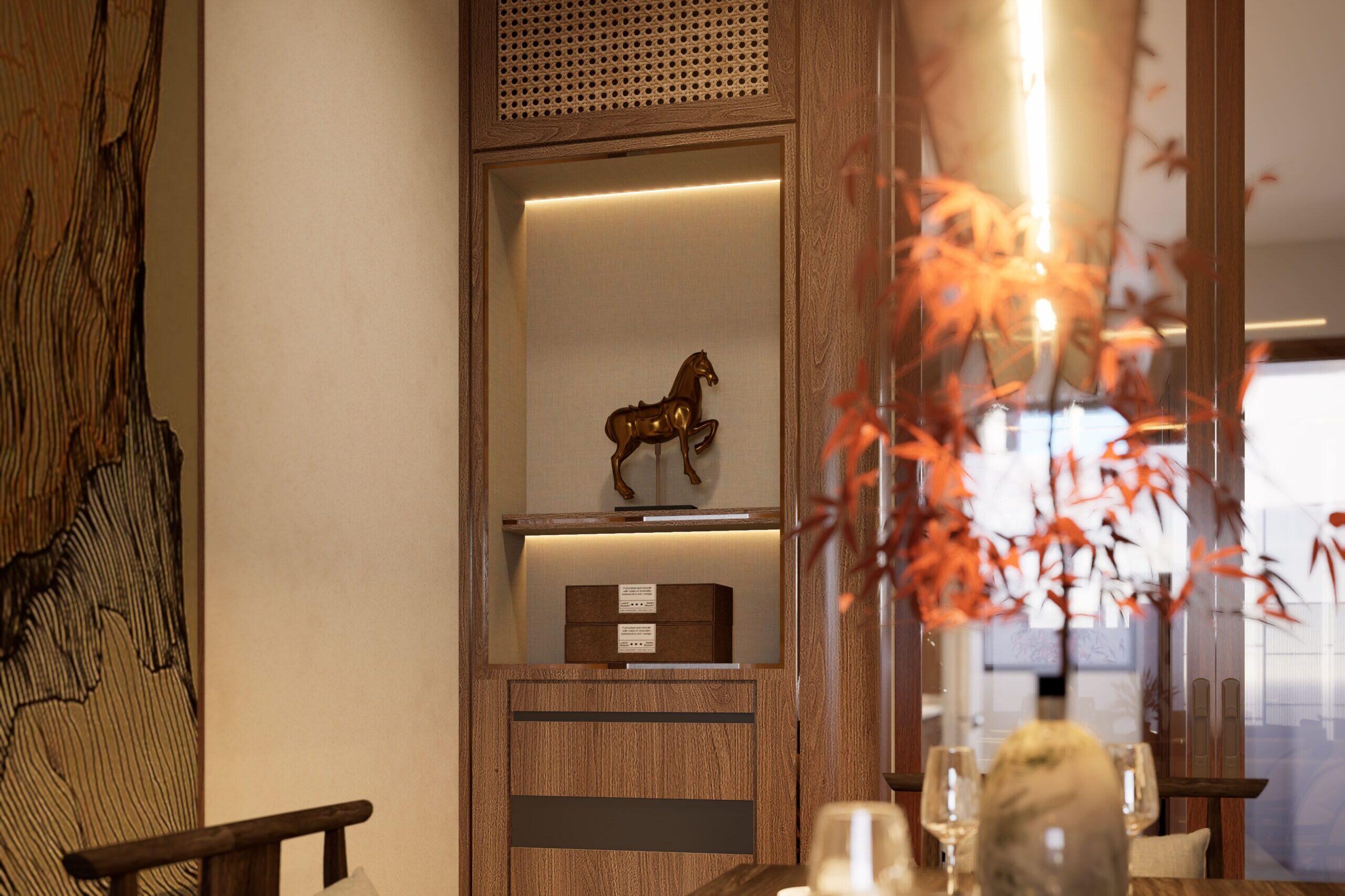 Infused with nostalgia, the dining space draws inspiration from the traditional family table, reimagined through a modern lens. Subtle pops of vintage hues add warmth and intimacy, while pendant lighting introduces a contemporary sculptural statement overhead.