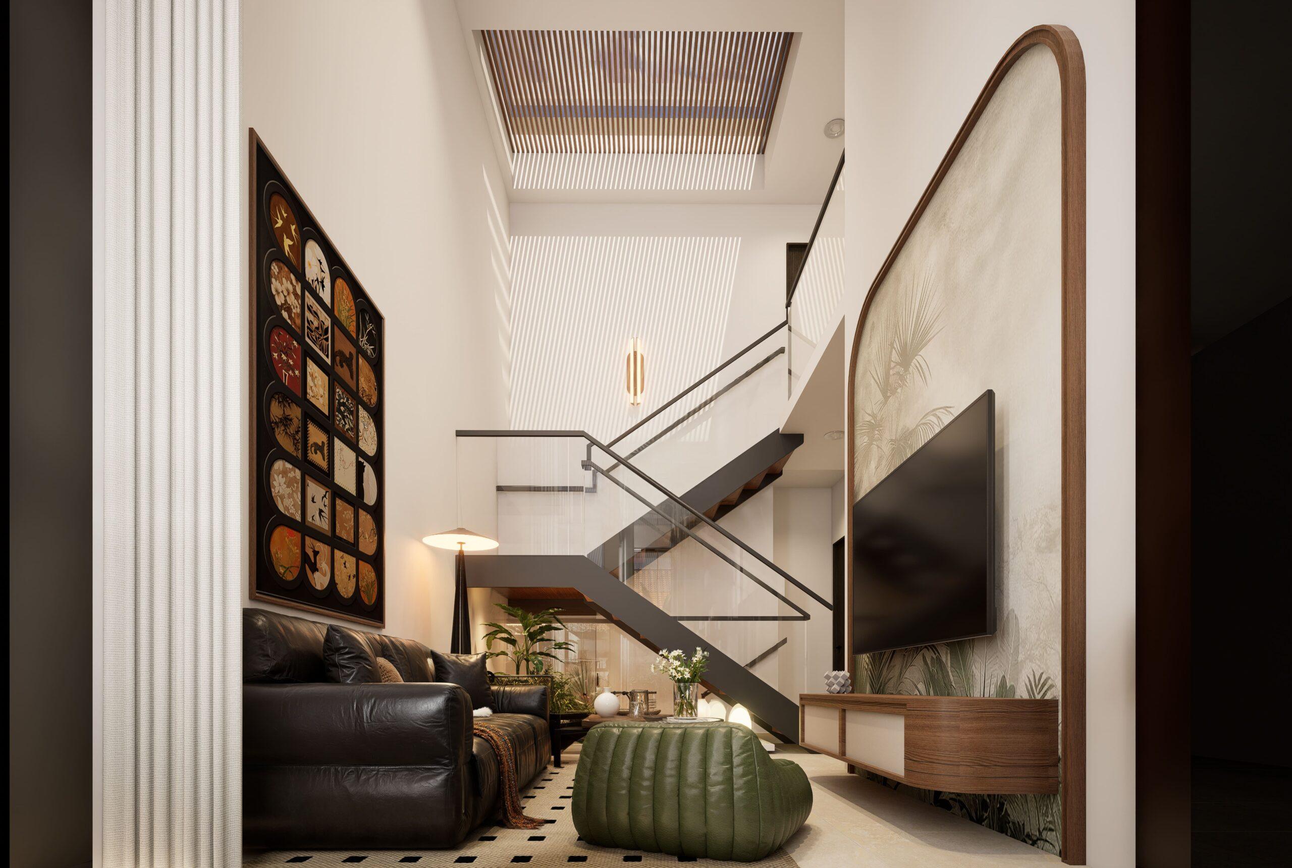 At the centre of the residence lies the family room – a grand, light-filled gathering space framed by a skylight and double-volume glass window. The interplay of air, light, and structure creates a sense of openness and emotional warmth.