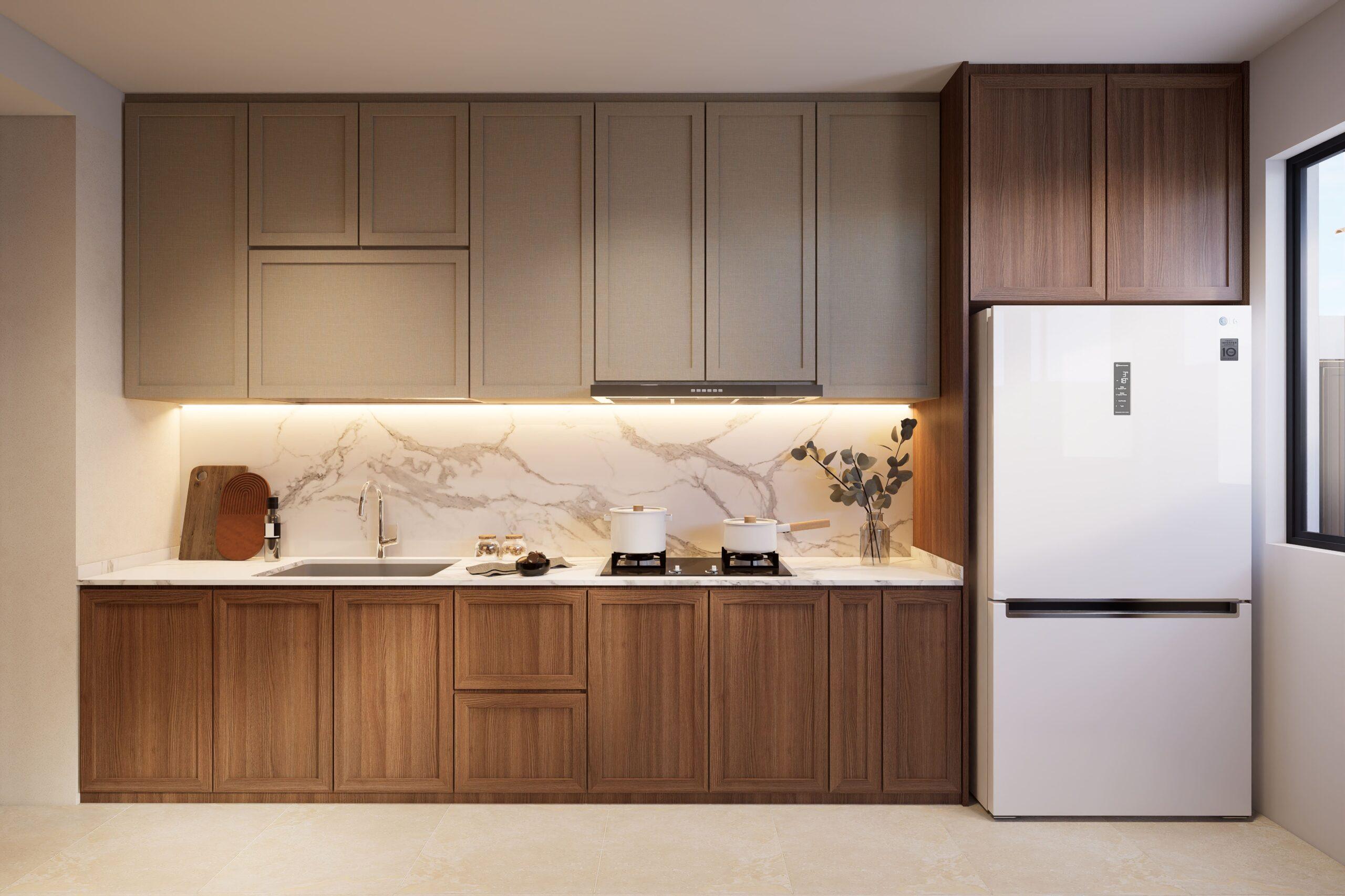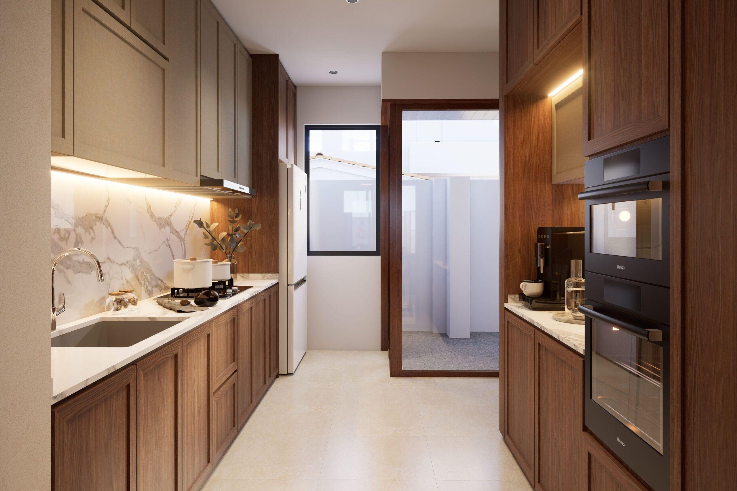 Designed as the heart of the home, the kitchen embraces both heritage and modern practicality. Custom-crafted carpentry and a marble backsplash echo Peranakan craftsmanship in refined form, bringing texture and depth to the clean-lined layout.