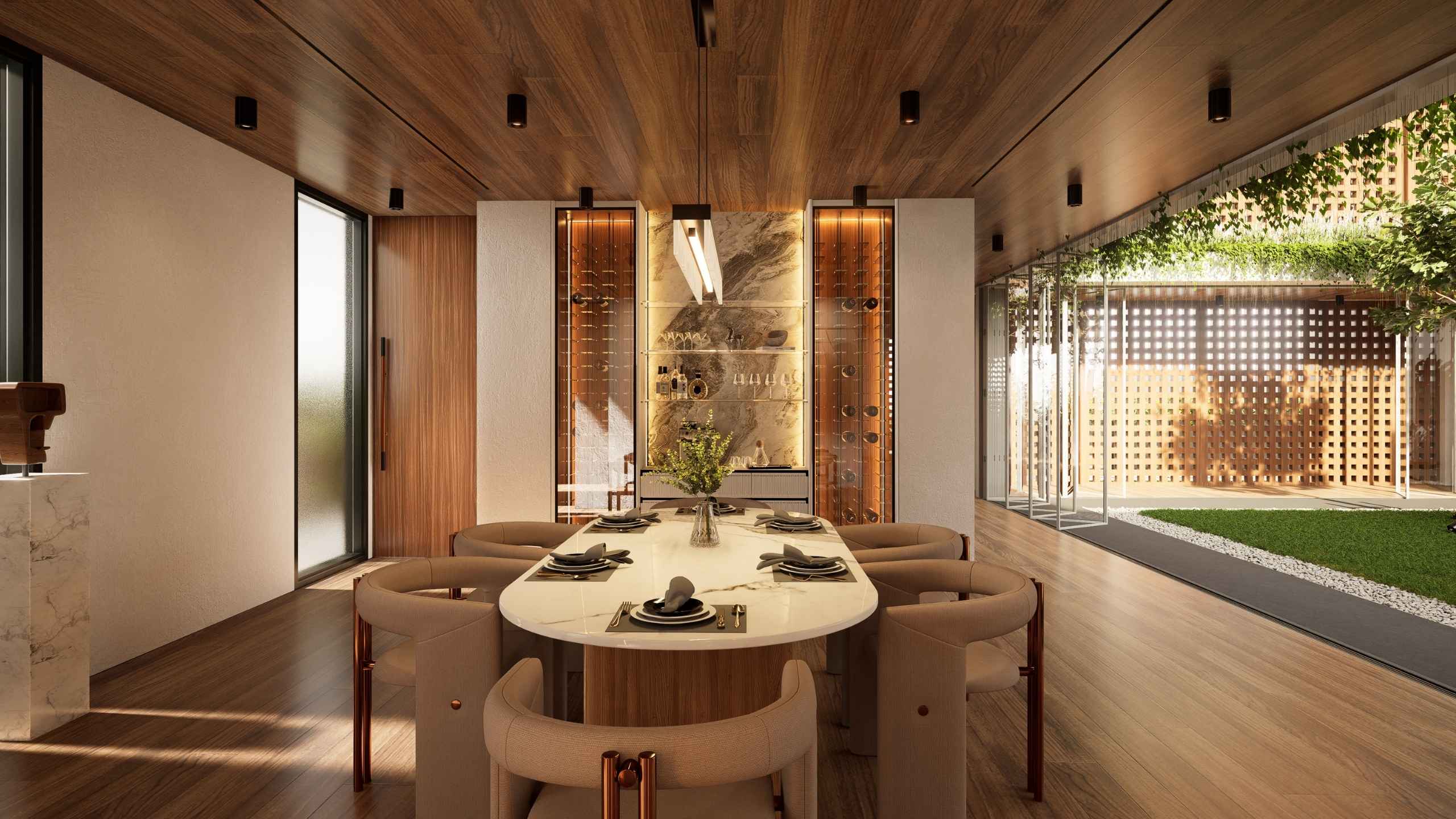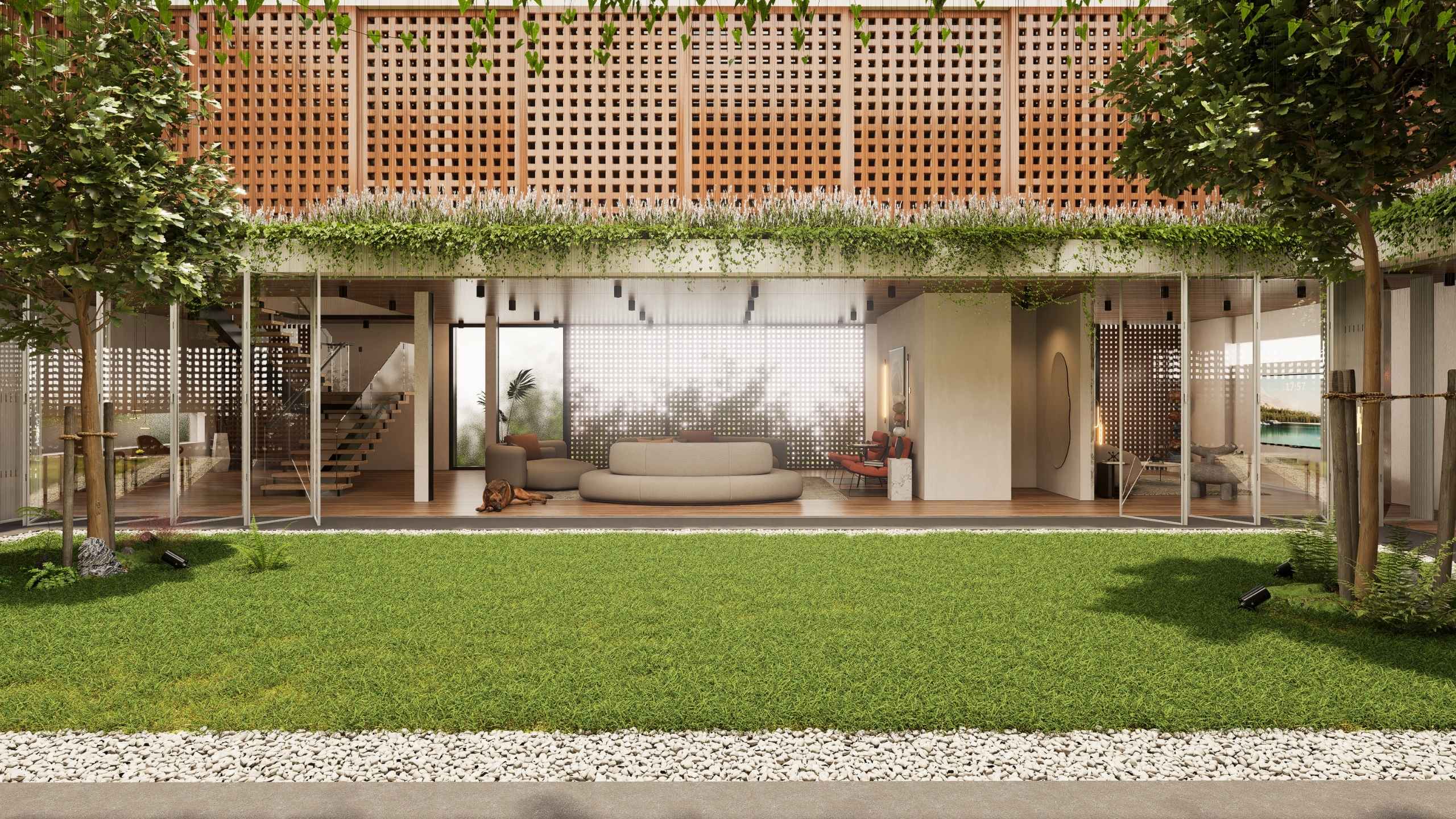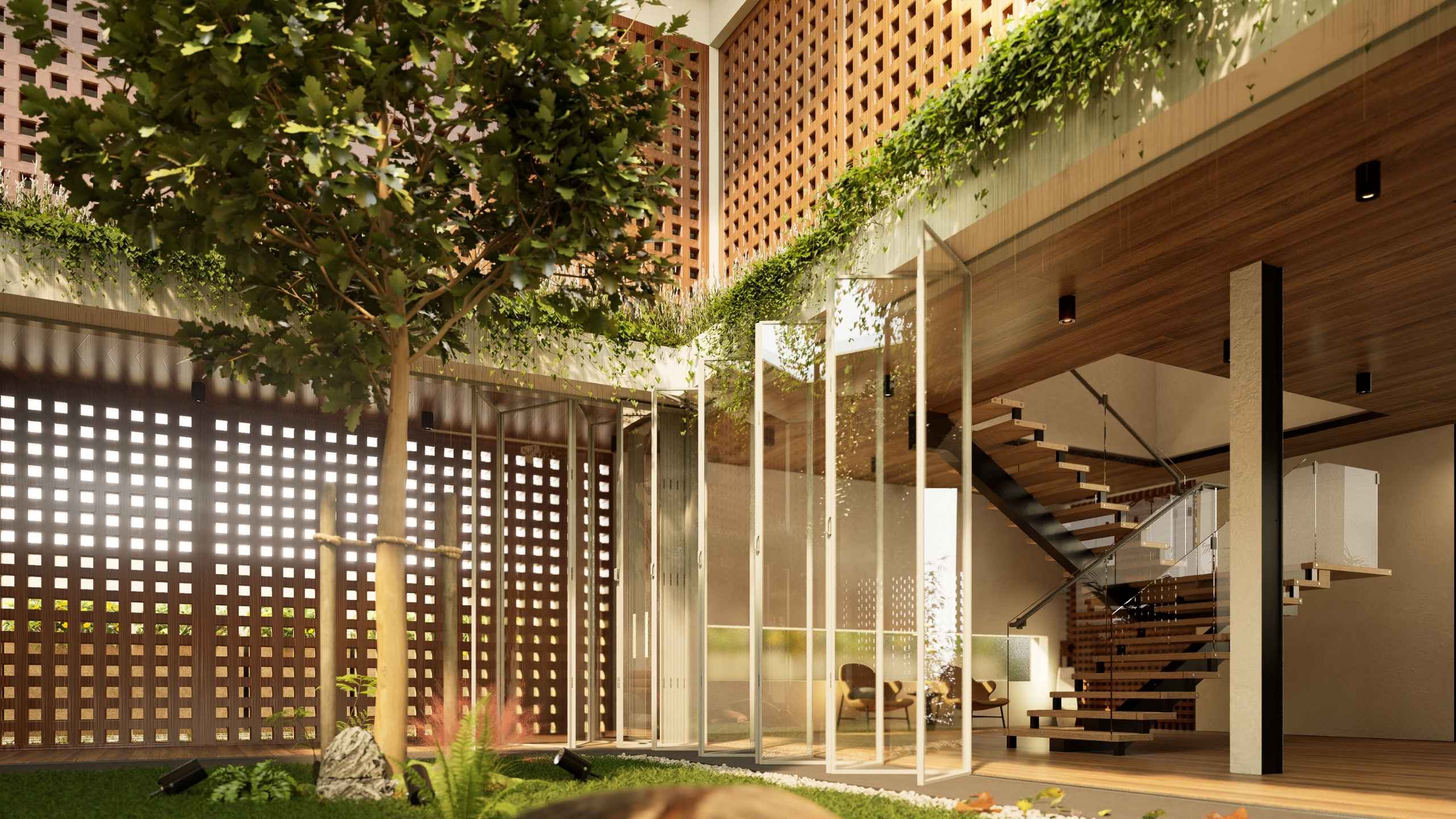 The second-storey facade is wrapped in perforated timber panels that exude both warmth and sophistication. Their nature finish softens the geometry of the architecture, while the patterned openings filter sunlight, invite breezes, and maintain privacy. Beyond aesthetics, the cladding enhances acoustic comfort and improves thermal performance, creating a serene environment that is as functional as it is beautiful.