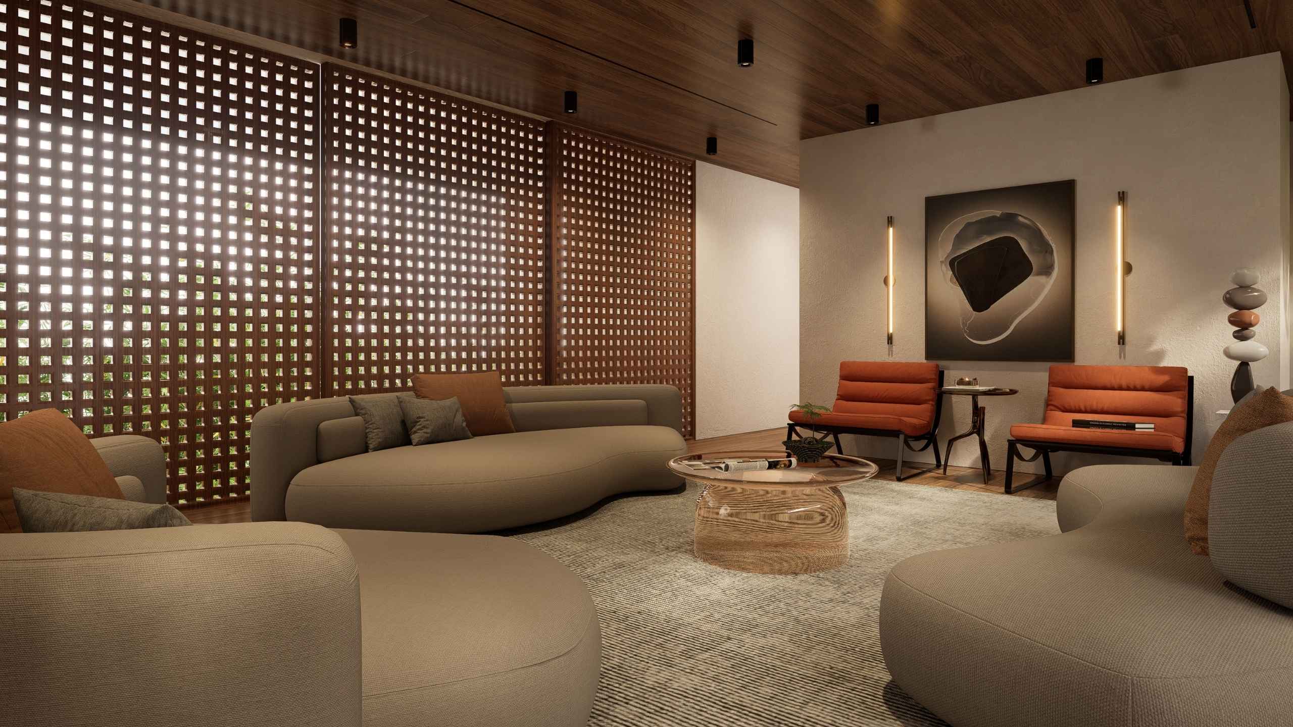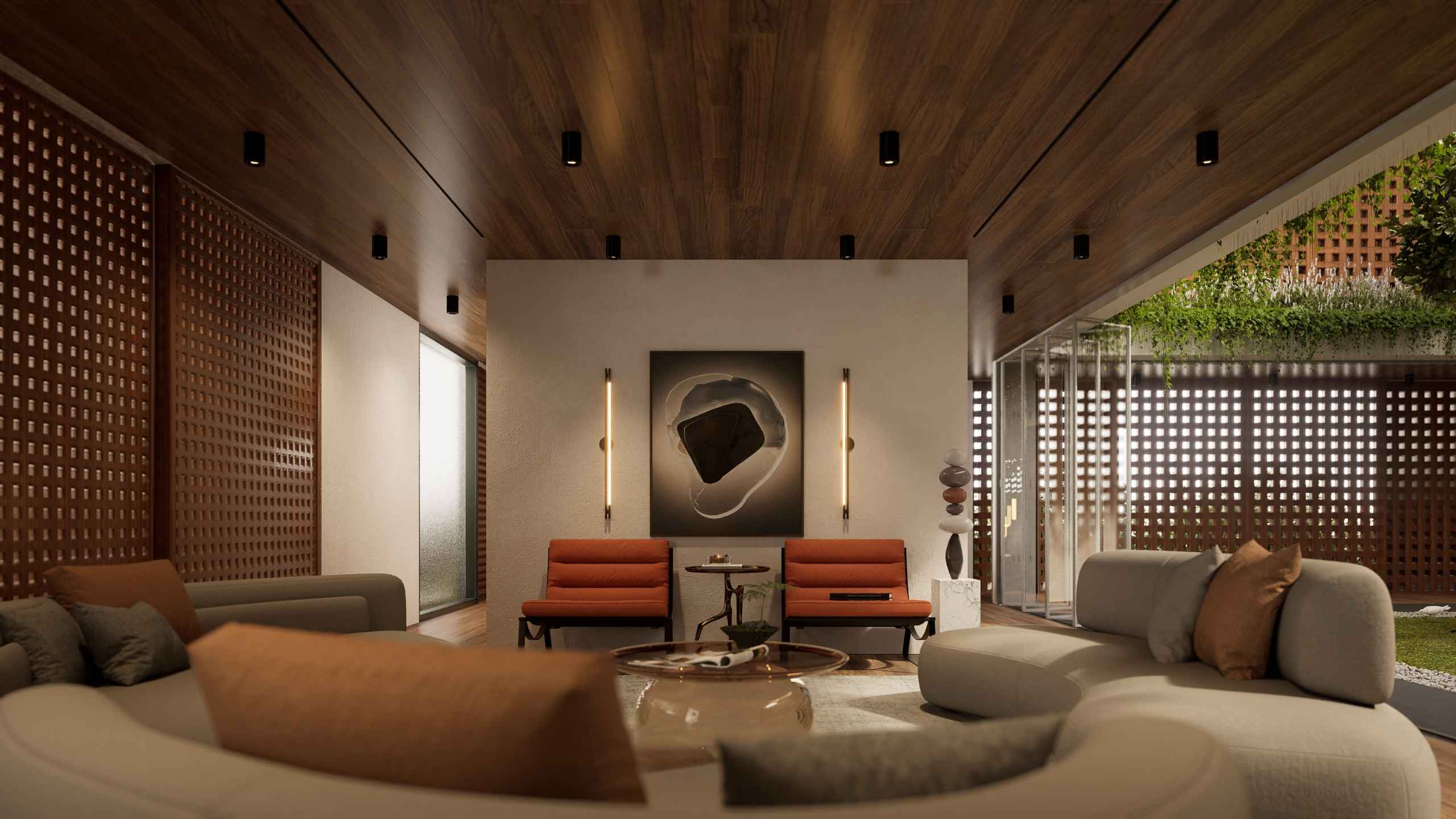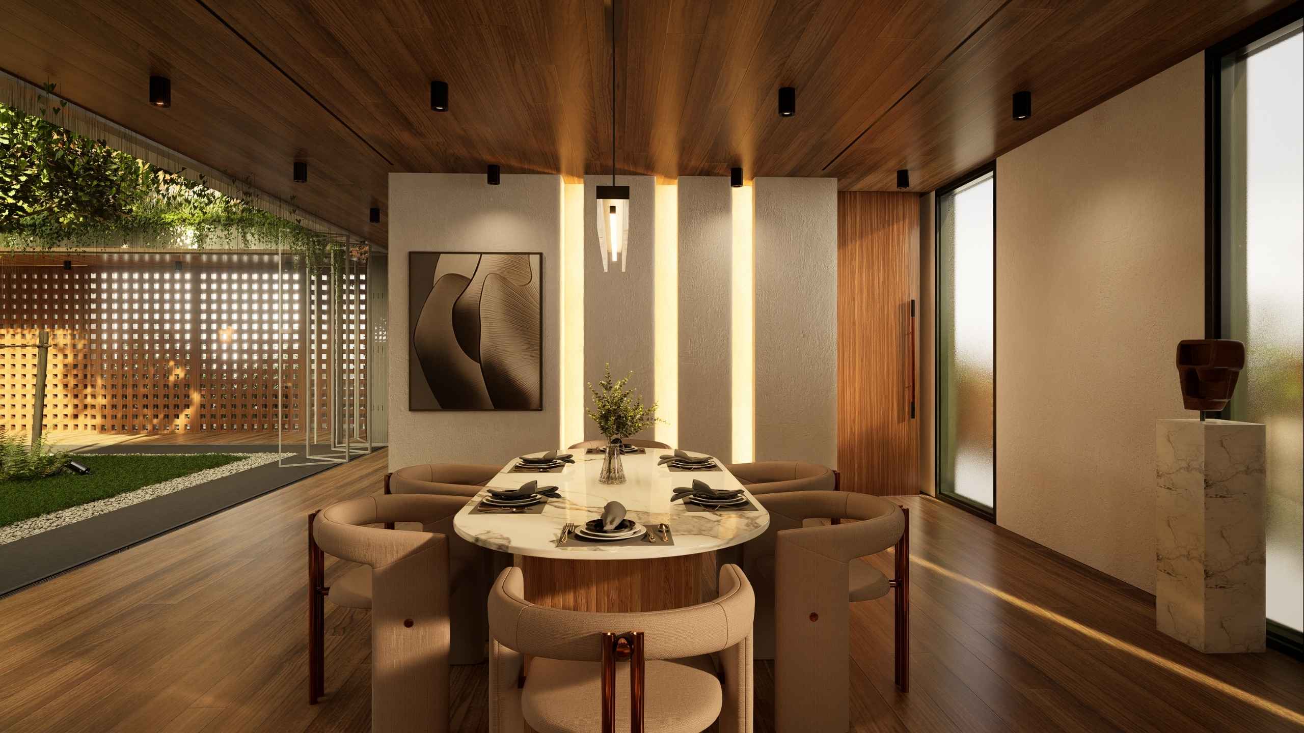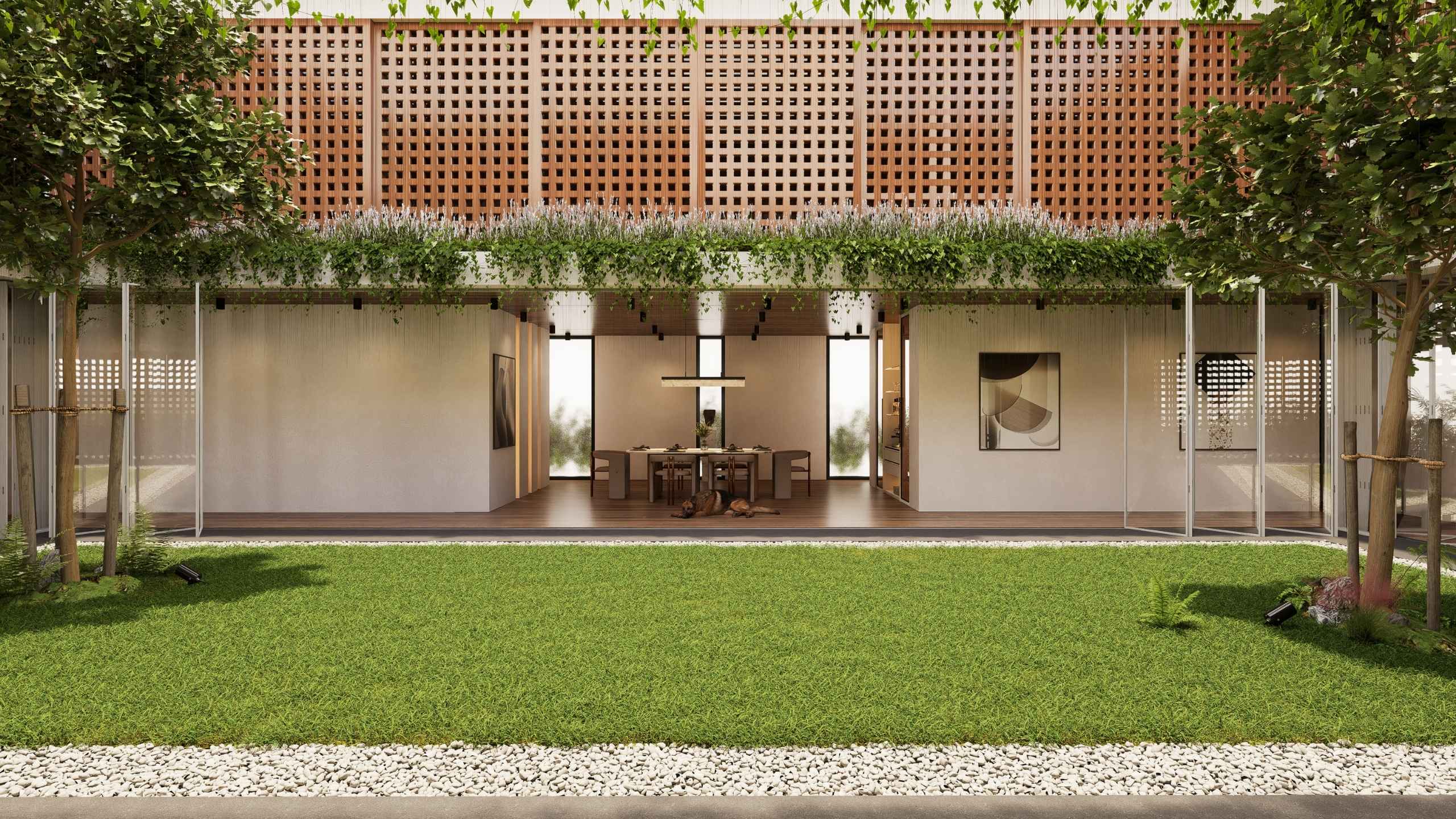 The second-storey facade is wrapped in perforated timber panels that exude both warmth and sophistication. Their nature finish softens the geometry of the architecture, while the patterned openings filter sunlight, invite breezes, and maintain privacy. Beyond aesthetics, the cladding enhances acoustic comfort and improves thermal performance, creating a serene environment that is as functional as it is beautiful.