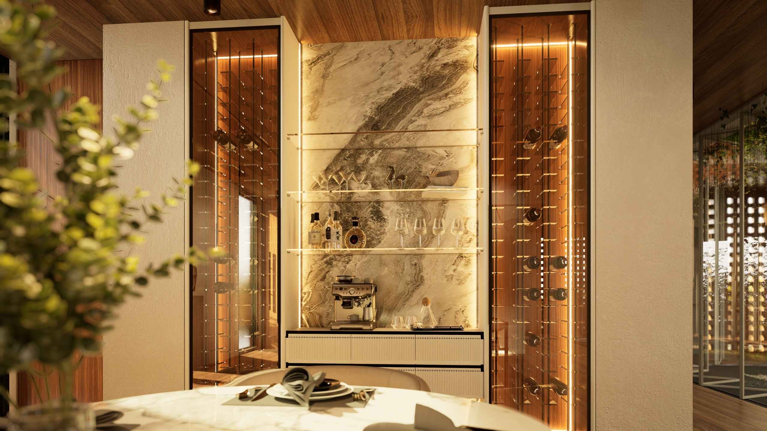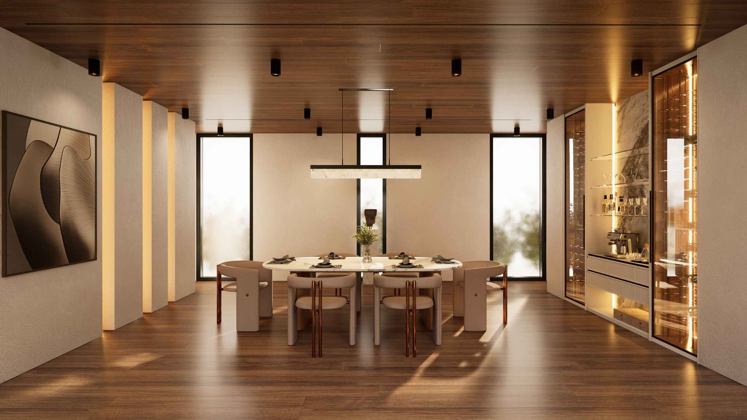 Light is considered as carefully as form. Vertical cove lights animate a long expanse of wall, subtly dividing it into refined panels. Whether dramatic or understated, the illumination enhances rhythm and proportion, underscoring the home’s modern sensibility while preserving an atmosphere of quiet elegance.