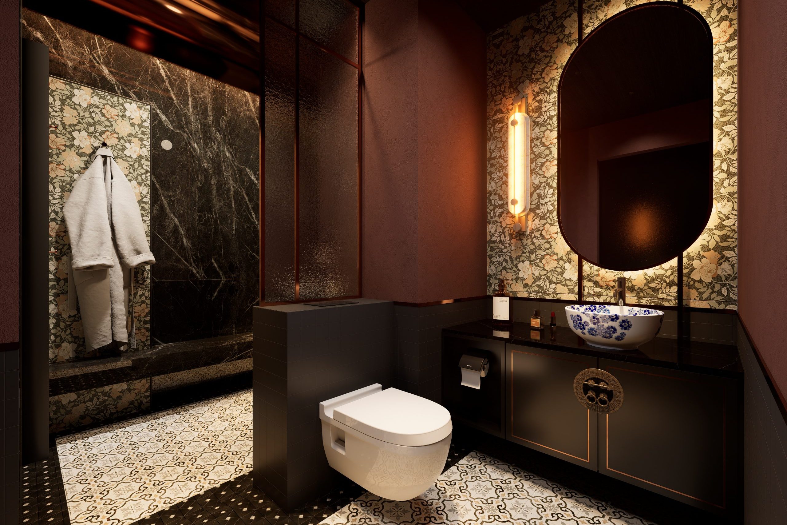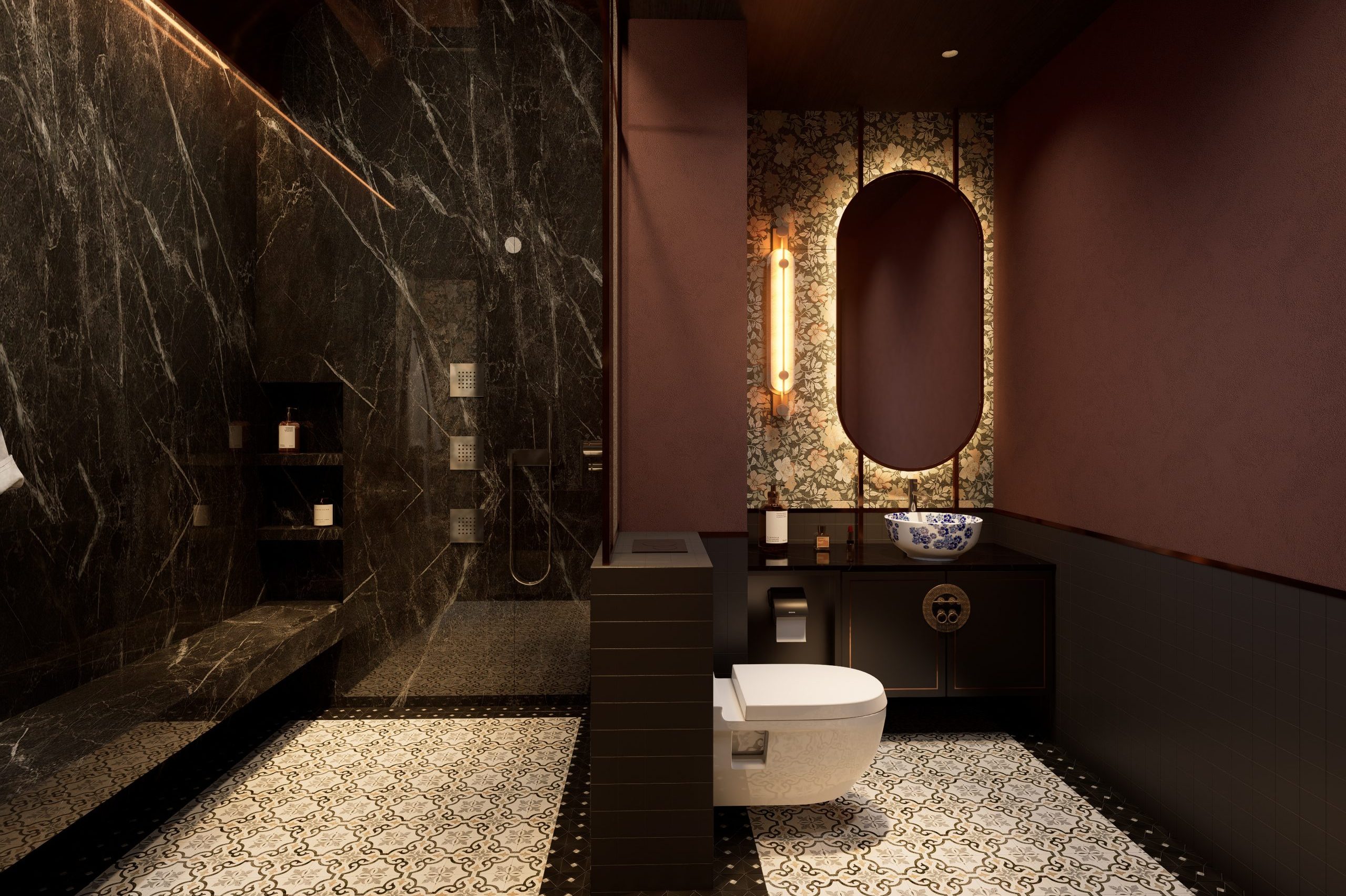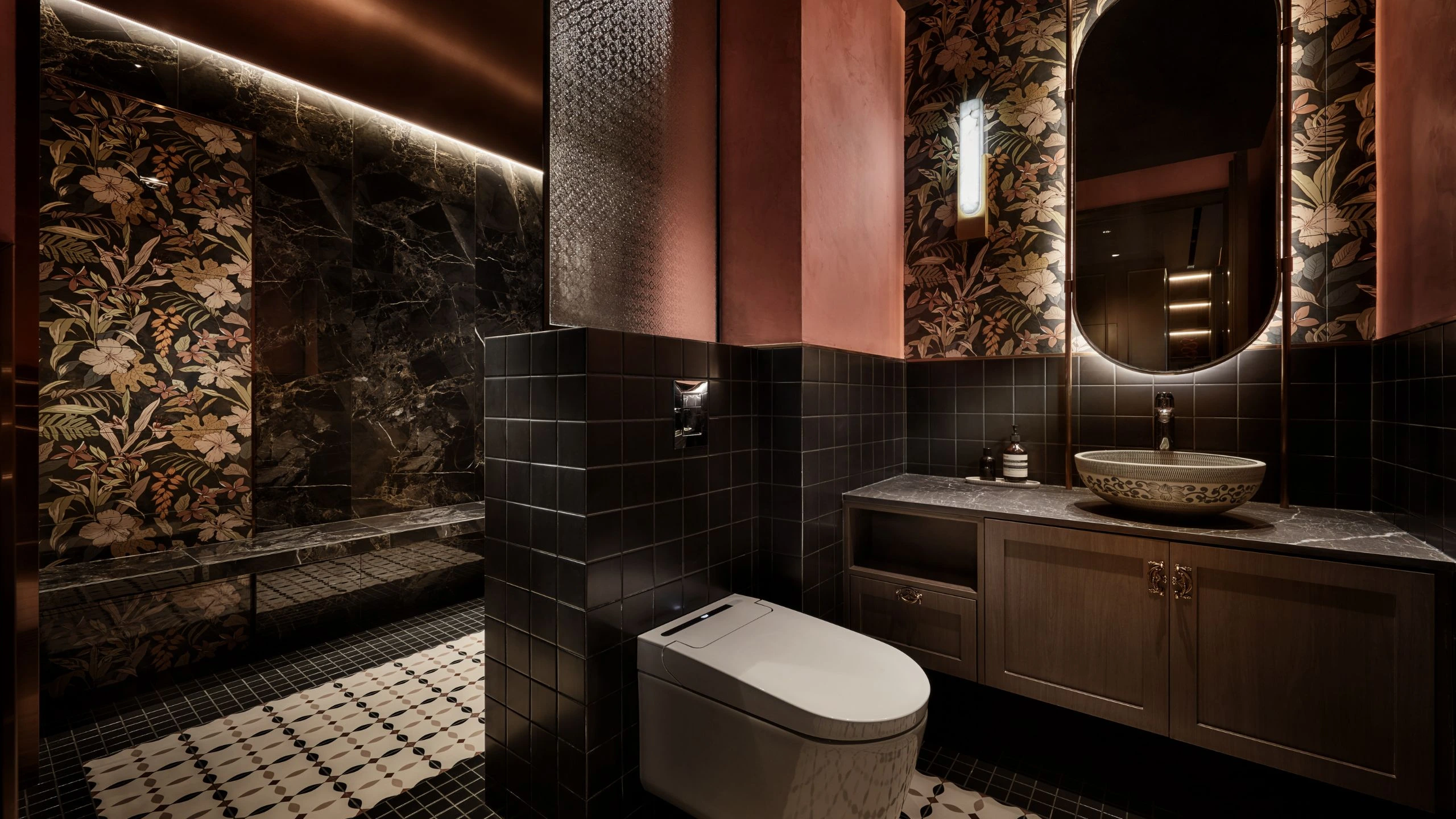 Equally remarkable is the powder room—a testament to the homeowner’s distinctive taste. With a strong preference for red, the design team embraced this bold palette and incorporated it with finesse. Rich crimson tones flow seamlessly alongside natural motifs, resulting in a striking yet balanced composition that feels both grounded and expressive.